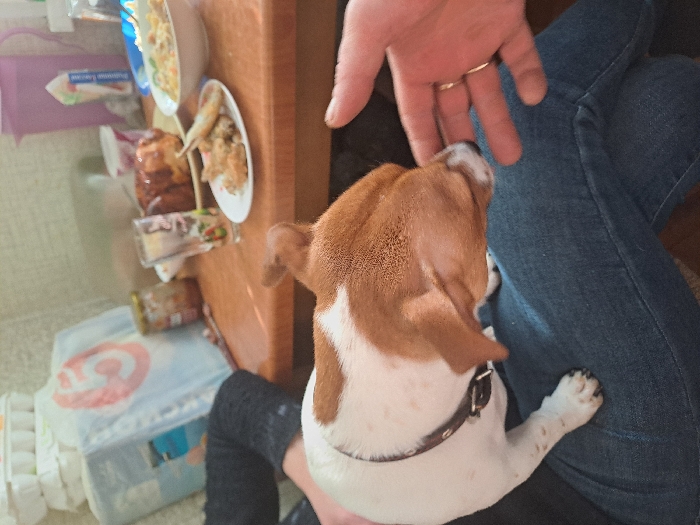 The image depicts an indoor scene within a residence in Bolshaya Elhovka, Russia. A small, short-haired dog with white and light brown markings, wearing a dark collar, rests on the lap of an individual wearing dark blue denim jeans and a dark long-sleeved top. A second individual's left hand, featuring a gold-colored ring on the ring finger, is extended towards the dog's snout. The dog's head is lowered, appearing to interact with the hand. On a wooden table in the background, various items are present: a white plate with fried food, a white bowl containing noodles, a large glazed pastry, multiple glass jars (one with a red lid), a clear glass tumbler with a decorative pattern, and a purple plastic pitcher. A light blue "Pyaterochka" supermarket bag with a red "5" logo is also visible, alongside a stack of white packaged goods in the background.
