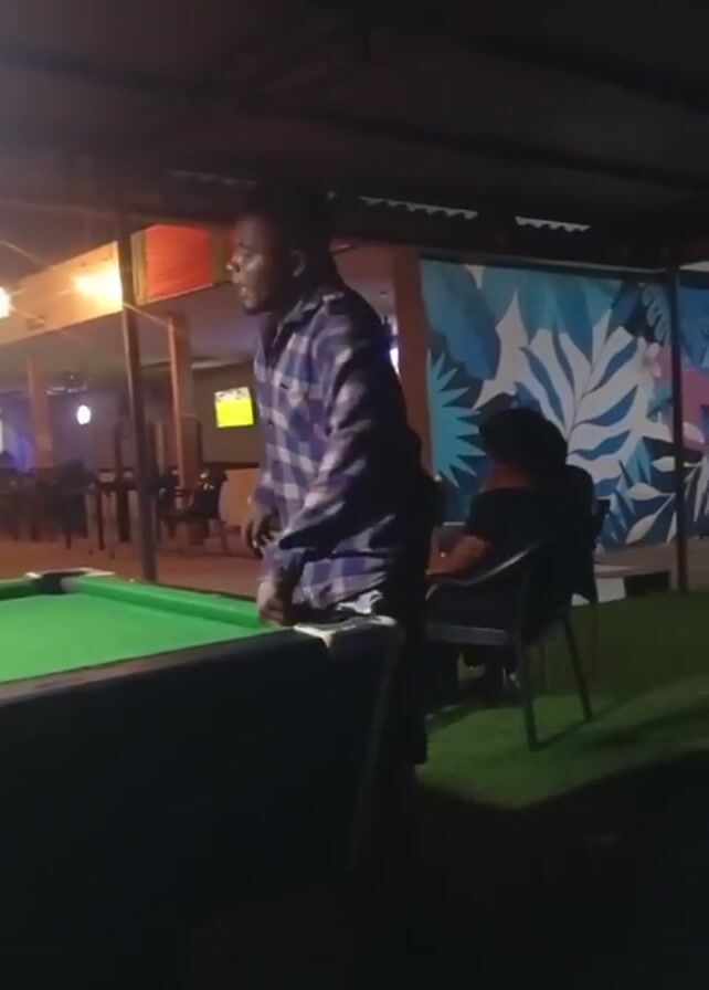 A man in a blue and grey plaid shirt is about to play pool on a green pool table, likely at an outdoor bar or entertainment area. A woman is sitting in a chair nearby, and the background shows other tables, lights, and a painted mural on a wall. The lighting is somewhat dim, adding to the nighttime ambiance.
