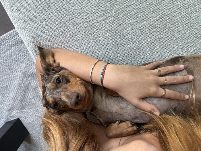 - "The image depicts a close-up, top-down view of a person holding a puppy on a light gray, textured fabric surface, presumably indoors in San Diego, United States of America" by FM-G9oSF3, licensed under CC BY 4.0