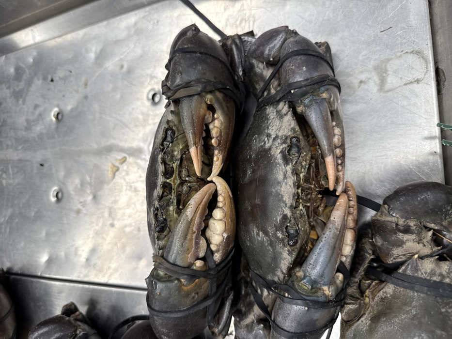 - "The image presents a close-up, top-down view of three large, dark-colored crabs, likely mud crabs, stacked on a brushed metallic surface" by FM-BCfsB2, licensed under CC BY 4.0