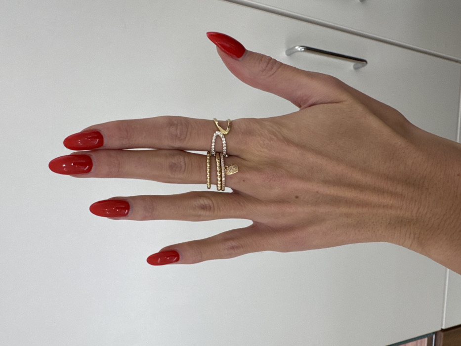 A single human left hand is positioned upright, palm facing away, against a plain, light-colored background. The hand exhibits five long, almond-shaped fingernails, each uniformly painted in a glossy, solid red. Three rings adorn the middle finger: a top gold-toned band with small spherical details, a central gold-toned band embedded with small clear stones from which a small gold-toned heart charm dangles, and a bottom gold-toned band with an open, U-shaped design. The skin is light to medium toned, showing minor wrinkling near the wrist and subtle hair follicles on the dorsal surface. A silver-colored, vertical handle of a cabinet or drawer is partially visible on the far right of the frame. The scene is situated in the city of Nuremberg, Germany.
