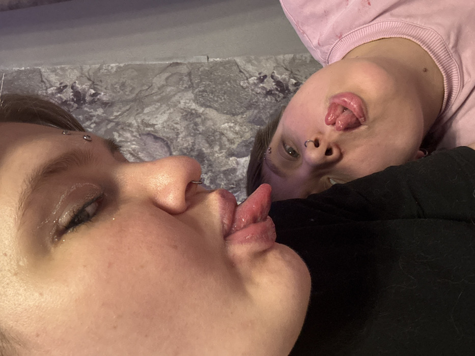 The scene is indoors, in an unspecified location within the city of Saratov, Russia. Two individuals, both appearing to be young adult females, are depicted in a close-up, tilted portrait. The individual on the left, positioned in the foreground, has light skin, an arched eyebrow with three small silver stud piercings, and glitter applied to the upper eyelid. A small silver hoop nose ring is visible in her nostril. Her mouth is open, with a bifurcated (split) tongue extended downwards and slightly to the right. She is wearing a black long-sleeved garment, visible on the lower left of the frame. Her gaze is directed downward. The individual on the right, positioned in the background and tilted approximately 45 degrees counter-clockwise, also has light skin and dark hair. She has two small silver stud piercings in her right eyebrow and a small silver hoop nose ring. Her mouth is open, with a bifurcated (split) tongue extended upwards and slightly to the left. She is wearing a light pink or lavender crew-neck sweatshirt, which appears to have faint reddish or pinkish staining on the right shoulder and collar area. Her gaze is directed generally forward and slightly upwards towards the viewer. The bifurcated tongues of both individuals are extended towards each other, appearing to touch or be in very close proximity in the center of the frame. The background consists of a textured wall, resembling grey and white stone or marble.