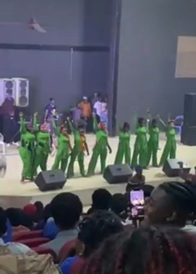 A group of approximately 10 female dancers wearing bright green outfits perform on a stage in a large auditorium. They are positioned in a line, performing synchronized dance moves, including raising their fists in the air. A live band is visible behind them to the left, including a drummer. The auditorium is filled with an audience, many of whom are recording the performance on their phones and raising their arms in the air in excitement. The stage is well-lit with spotlights, and the background is a plain dark gray wall. Speakers are on either side of the stage. The focus of the video is on the performance and the enthusiastic reaction of the audience.