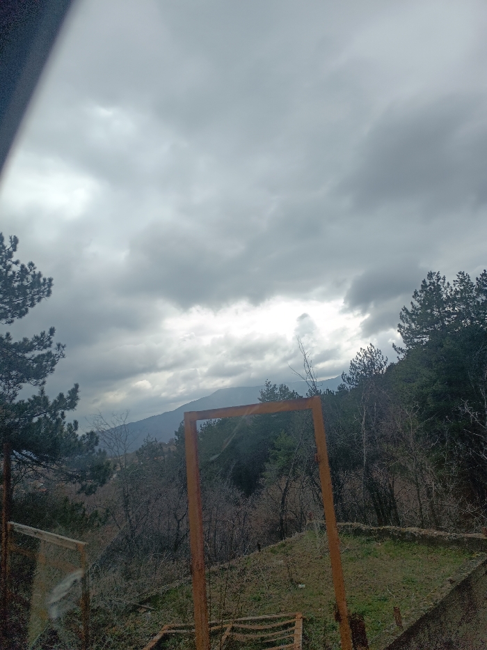 The image captures an elevated, outdoor landscape view identified as being from or near the city of Yavrovo, Bulgaria. The upper half of the frame is dominated by a heavily overcast sky, filled with dense, grey stratus clouds. Brighter patches within the cloud cover suggest areas of diffuse light penetration. A dark, blurry, diagonal obstruction is visible in the extreme upper left corner of the image, extending downwards. In the foreground, a prominent, vertically oriented, rectangular structure constructed from rusty, dark orange-brown metal stands centrally. This structure appears empty, framing the landscape beyond it. The immediate ground around the metal frame consists of dry, sparse green grass, exposed earth, and scattered dry brush. To the left and right of the frame, and extending into the midground, are slopes densely covered with a mixed forest of evergreen coniferous trees (primarily pines) and numerous bare deciduous trees, suggesting a cooler season. A significant reflective glare or lens flare obscures the majority of the lower left quadrant of the image, rendering underlying details indistinct. Faint outlines consistent with a window pane or another reflective surface are minimally discernible beneath this glare. The lower right foreground reveals the edge of a concrete or stone structure, possibly a wall or foundation. In the background, multiple layers of mountains or hills recede into a light atmospheric haze. No individuals, animals, or explicit actions are depicted within the scene.