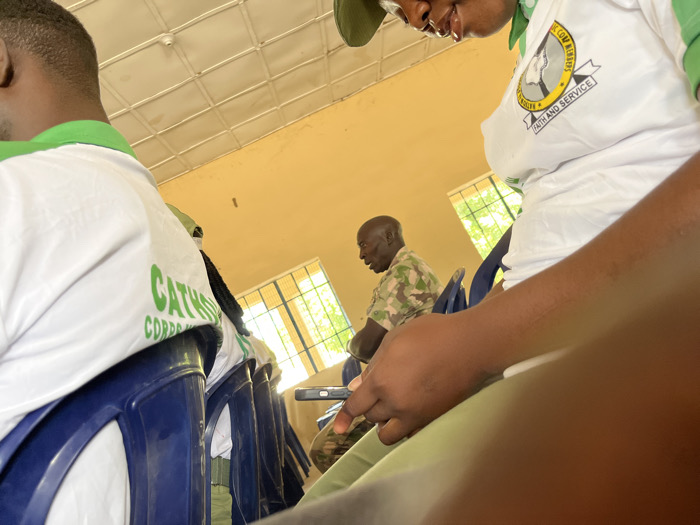 The image displays an indoor gathering, likely a meeting or training session, within a room characterized by light yellow walls and a white paneled ceiling containing a visible ceiling fan and a circular light fixture. Windows on the right side allow natural light, revealing green foliage beyond. The event is understood to be located in Maiduguri, Nigeria, as specified in the prompt. In the foreground, the right side shows a partial view of a person with dark skin, wearing a white polo shirt with a green collar and a cap. The shirt features a logo with text including "CATHS," "CORPS," "FAITH AND SERVICE," and an emblem depicting a head silhouette. The person's hand is visible, suggesting interaction with a small, obscured device as they look downwards. Behind this individual, the back of another person's head and shoulders are visible, clad in a similar white and green collared shirt, seated in a blue plastic chair. In the mid-ground, a bald, dark-skinned man of middle to elderly age is seated in a blue plastic chair, wearing a camouflage-patterned short-sleeved shirt. He is looking down and to his right, appearing focused on an object or activity outside the immediate camera frame. Multiple other individuals, similarly dressed in white and green shirts, are visible in the background, seated in blue plastic chairs, indicating a structured assembly of participants.