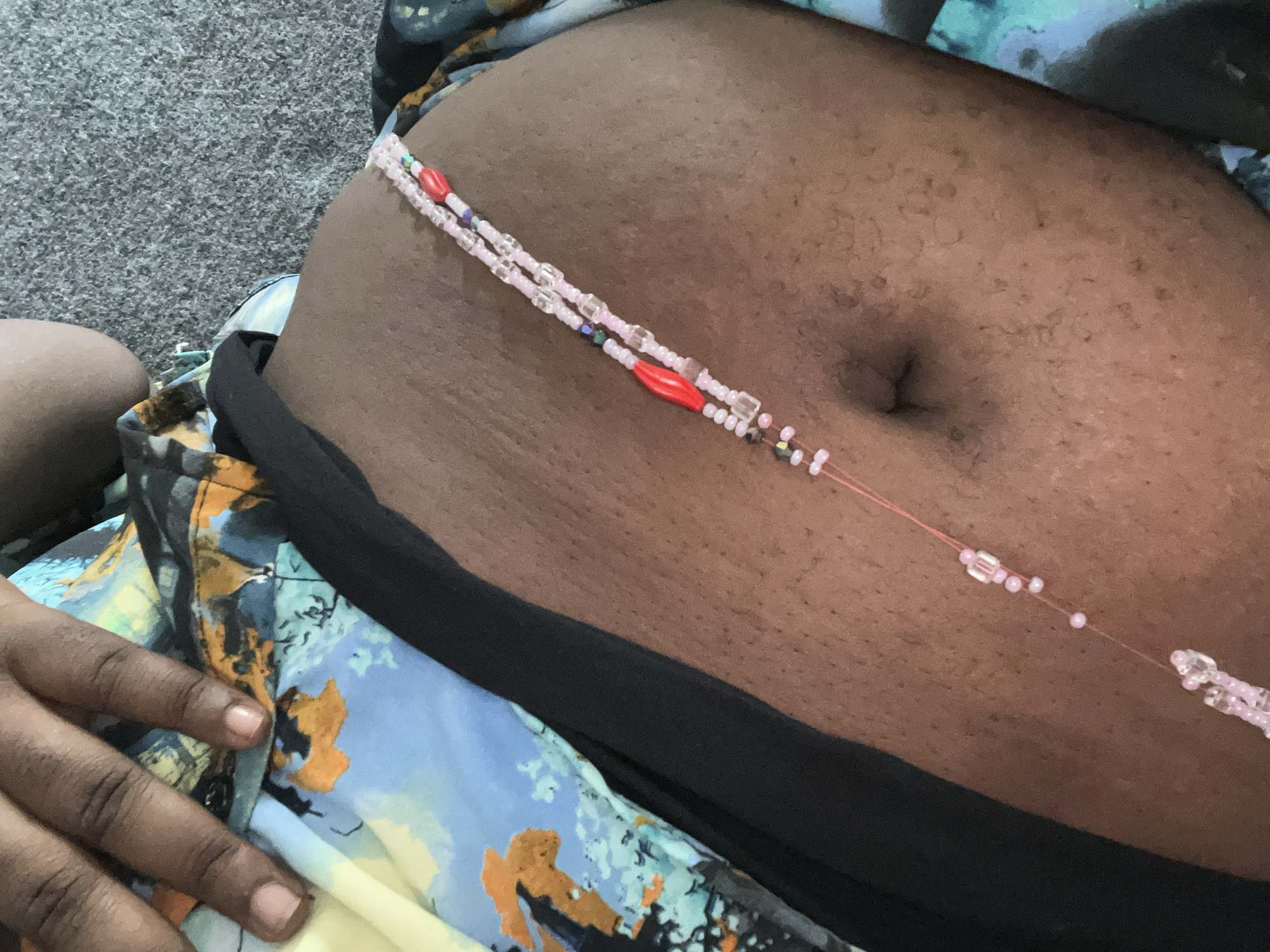 A close-up shot depicts the torso of a dark-skinned individual, likely female, adorned with a beaded waist chain. The chain, composed of pink, white, and red beads, encircles the midsection just above the navel. The person is wearing a floral-patterned garment with a black waistband. A hand with dark skin is visible in the lower left corner of the frame. The background consists of gray carpet or similar fabric. There is no location information available from the image.