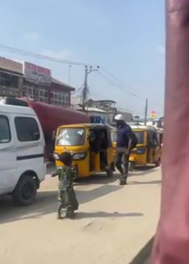 The video depicts a street scene in what appears to be an urban area. Several people are visible. A young child in a patterned green and brown outfit is walking barefoot on the side of the road. A woman wearing a yellow hijab is also walking in the same direction. A man in a dark shirt and hat is standing by a yellow auto-rickshaw. Several other yellow auto-rickshaws, a white van with items on its roof, and a red truck are parked nearby. A building with a sign that reads "CCTV CENTER" is visible in the background. The street is dusty and appears to be in a busy commercial area. People are walking and vehicles are parked along the street.