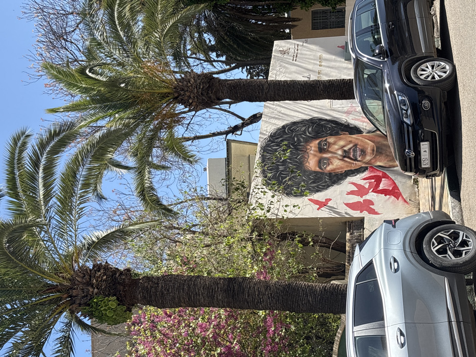 An outdoor street scene in Meknes, Morocco, captured on a clear, sunny day. The central feature is a large, colorful mural painted on a light-colored building wall. The mural depicts a realistic portrait of a man with dark, voluminous curly hair, into which green foliage is integrated. Below the man's chin, several red bird silhouettes appear to be flying upwards. Arabic script and dates "03-05-1951 - 04-03-1995" are visible to the right of the portrait, identifying the subject as "Ahmed Bennani" and the mural as "Nadi Al Massira." Two palm trees stand prominently in the scene; one on the left frames the mural, and a second on the right partially obscures the wall. The left palm tree has a cluster of green plant growth at the base of its fronds. Behind the trees and mural, various other deciduous trees and bushes, including one with bright pink/purple blossoms on the far left, are visible. Parts of light-colored buildings with flat roofs can be seen in the background above the wall. In the foreground, two parked vehicles are visible. On the left, the rear portion of a light grey SUV with black wheel arches and multi-spoke wheels is present. On the right, a black Volkswagen Tiguan SUV is parked parallel to the curb, facing left, with its Moroccan license plate "82151 | 1" clearly visible. The overall scene suggests an urban environment with a blend of natural elements and street art.