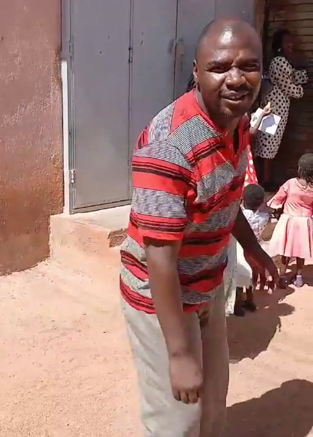 man standing outside of a building, with other people and children around. He is wearing a red and black striped shirt and gray pants. He makes the peace sign with both hands. The building appears to be made of a light brown or beige material and has a staircase leading to a higher level. The ground is covered in a reddish-brown dirt or sand. Cars are visible in the distance.