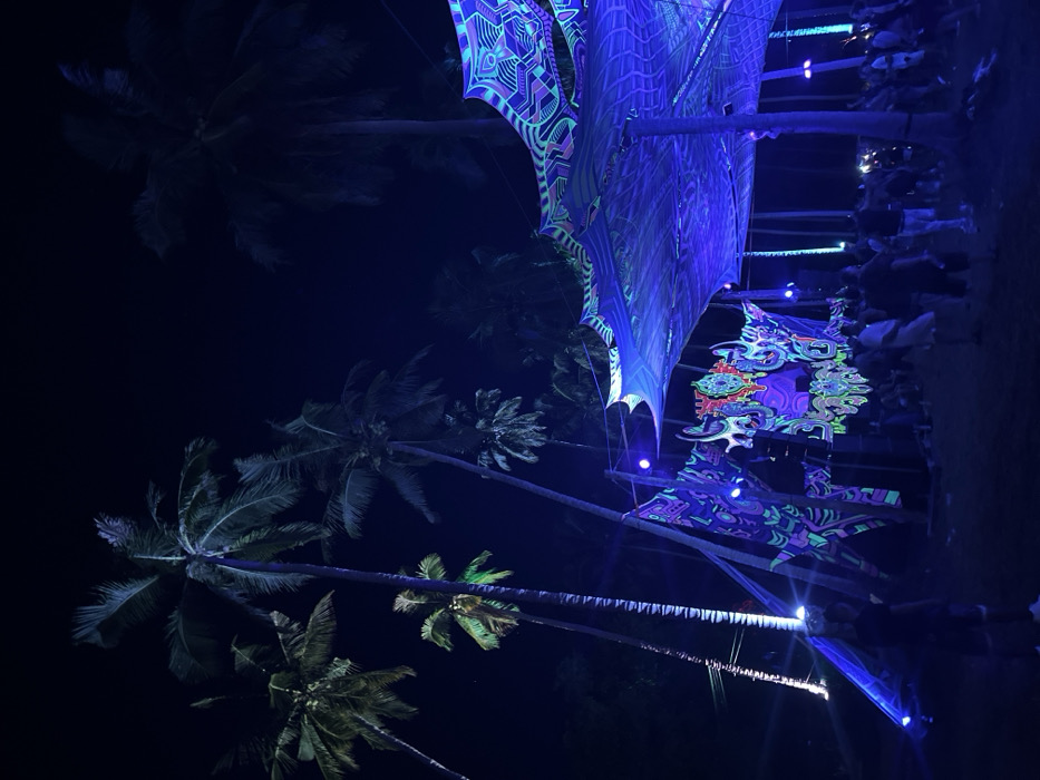 The image depicts a nighttime outdoor gathering in Thong Nian, Thailand. A large, temporary fabric structure is centrally featured, comprising an overhead canopy and a vertical backdrop. Both the canopy and backdrop display complex, geometric patterns that fluoresce intensely in neon blues, greens, and pinks, illuminated by unseen UV light sources. The backdrop, approximately 5 meters wide, presents a central, intricate design. This structure is supported by visible poles, some appearing to be natural tree trunks, and tensioned lines. Approximately 30 to 50 individuals are present in the foreground and midground, standing and gathered beneath the canopy and in front of the decorated backdrop. Their specific actions are limited to standing and collective congregation. Multiple tall palm trees, some with fronds subtly illuminated by blue and green lights, frame the scene against a dark, cloudless night sky. Bright blue and white spotlights are strategically positioned, illuminating sections of the structure and tree trunks. The ground surface beneath the crowd is dark and indistinct.