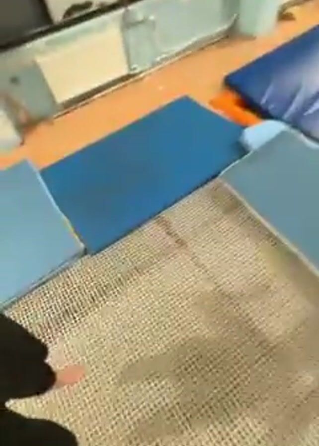 person performing a series of handsprings on a carpeted floor with blue and white mats nearby. The camera perspective is low, focused on the person's feet and hands as they move. The carpet is light-colored with a grid pattern. The mats appear to be foam. The person is wearing black pants and a white shirt. The video is shaky and mostly focuses on the floor and mats.