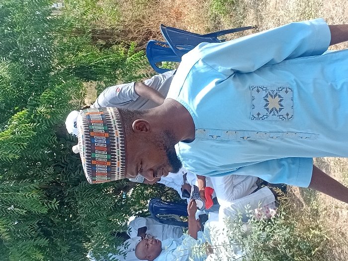 A group of men are outside, with one man in focus. He is wearing a light blue traditional shirt with an embroidered chest pocket and neckline and a kufi cap with a patterned design. Other men are seated behind him, some wearing white robes and caps. A blue plastic chair is also visible in the background. Green trees and foliage are scattered around the scene, suggesting an outdoor gathering.