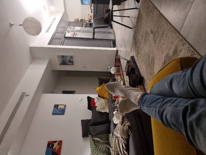 A person in jeans and white socks sits on a yellow chair. A gray couch with pillows and a blanket is beside the chair. A small table with decorative items is in the background. The space includes a gray rug, a kitchen area with gray cabinets and a silver refrigerator, and white walls with colorful art. A white, round lamp hangs from the ceiling.