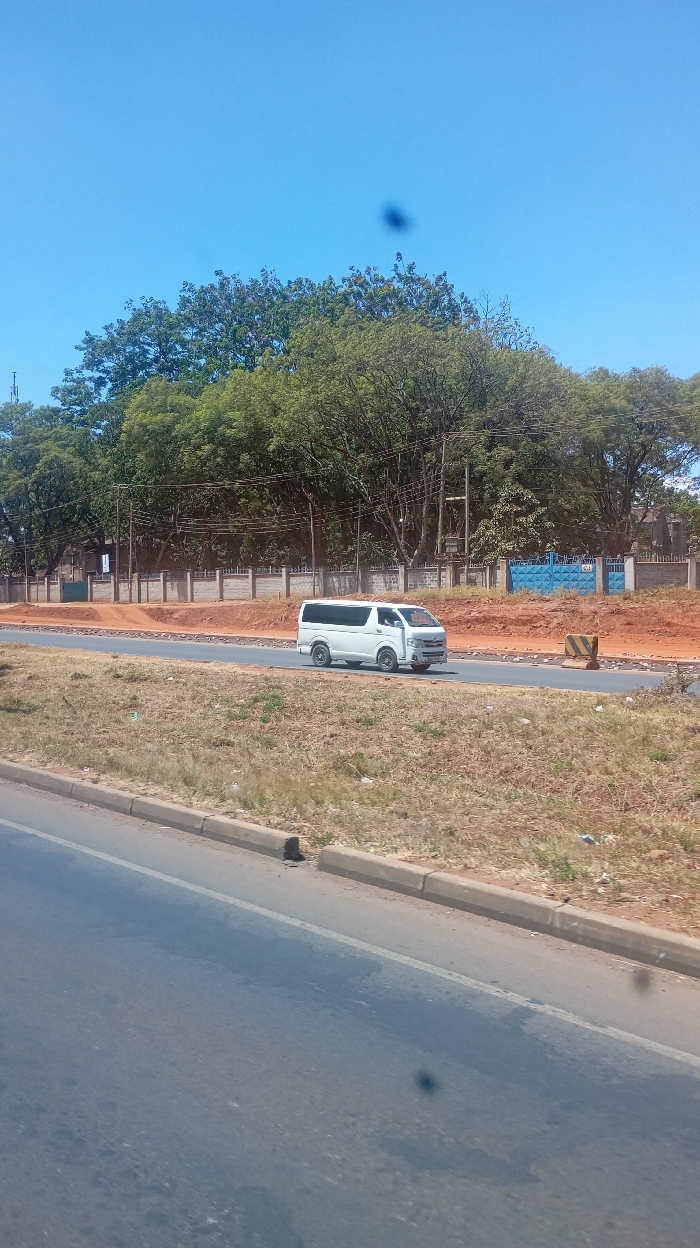 A white van drives along a newly paved road under a clear blue sky. The road is bordered by a grassy patch and a lower street. A concrete fence and dense green trees line the background, partially obscuring buildings and utility poles. There are dark spots appearing in the image, especially in the sky and the road.