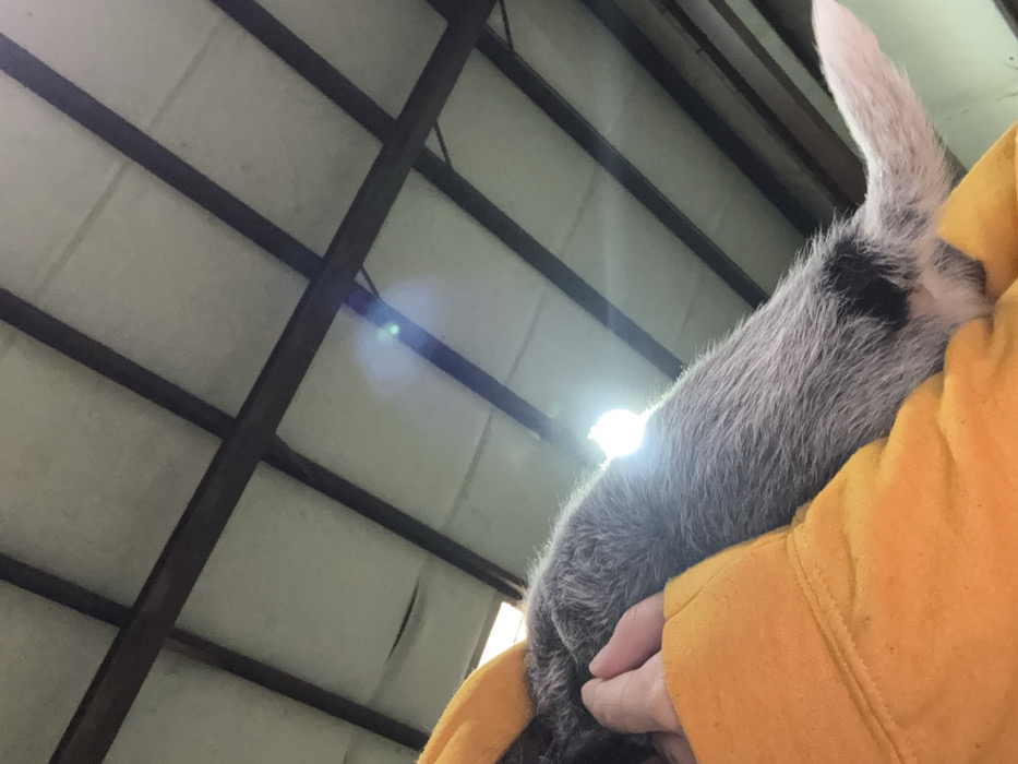 A close-up, upward-angled photograph depicts a small, grey and white animal, likely a dog, being held by a person wearing an orange long-sleeved garment. The animal's white tail is visible on the right, with a dark patch of fur near its hindquarters. A person's hand is visible interacting with the animal's mid-section. The background shows an interior ceiling structure consisting of light-colored panels supported by dark, intersecting structural beams, possibly metal. A bright light source, appearing as a significant glare, is visible within the upper portion of the frame, illuminating the animal's fur. The scene is located in Ball Ground, United States.