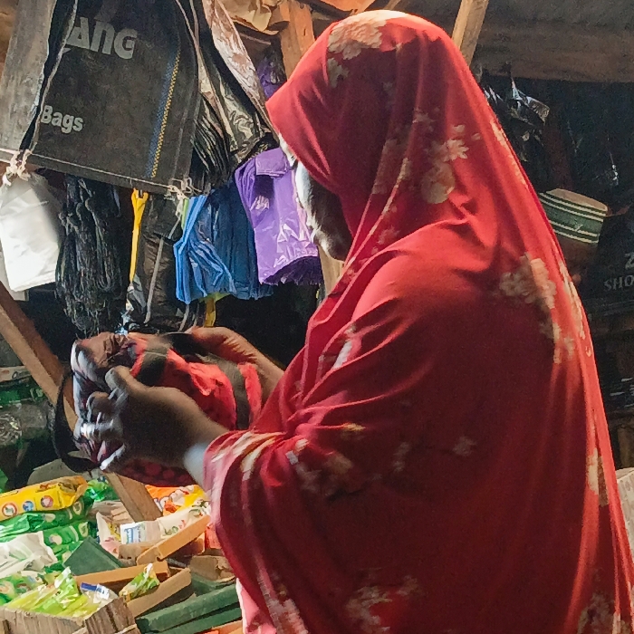 An older woman with dark skin is visible in profile, facing left, within what appears to be an indoor market stall or shop in Shendam, Nigeria