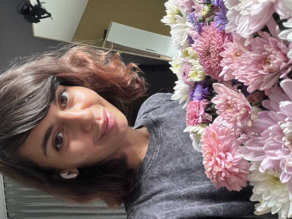 A female subject is depicted in a close-up, chest-up portrait shot, situated indoors in Nusa Dua, Indonesia. The individual, an adult, has dark brown hair with reddish highlights on the right side, styled with a fringe, and brown eyes. She wears a dark grey, textured crew-neck sweatshirt and a single white earbud in her left ear. Her expression is a slight smile, directed towards the camera. She holds a large bouquet of assorted flowers, primarily chrysanthemums, which fills the lower half of the frame. The flowers are white, various shades of pink, and purple. The background on the left features a light-colored curtain. On the right, a white vertical panel, likely part of furniture, is visible against a light brown wall. A dark, indistinct object is partially visible above the white panel. The scene is illuminated by ambient light.
