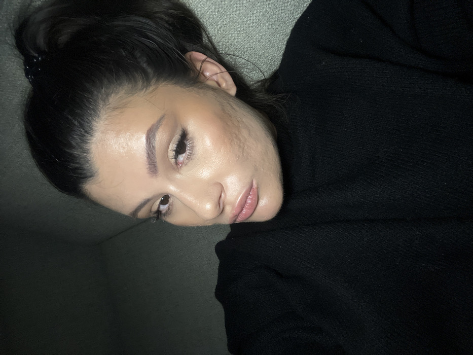 A selfie-style image depicts a female individual from the chest up, positioned indoors in Kiryat Bialik, Israel. The subject, an adult female with dark hair styled in a high ponytail secured by a black hair tie, is oriented facing slightly to the viewer's right, looking directly towards the camera. She wears a black high-neck, long-sleeved sweater. Her skin tone is light to medium, exhibiting makeup application including winged eyeliner, filled eyebrows, and a luminous finish on the cheekbones, with some visible skin texture on her cheeks. Her lips are full and slightly parted, showing a glossy finish. The background is uniformly dark green or grey, consistent with upholstered furniture, providing a soft, out-of-focus backdrop. Lighting appears to be even, emanating from the front, highlighting the subject's face. No other individuals or distinguishing objects are visible.