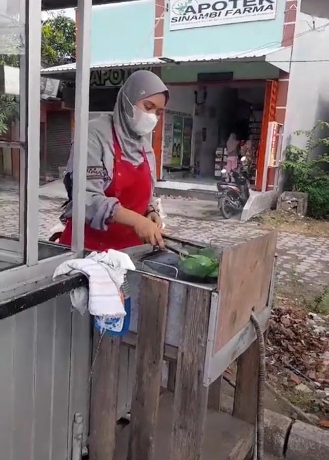 A woman wearing a gray headscarf, a white face mask, and a red apron, is working inside a small food stall. She is standing in front of a wooden table with a metal basin containing some dark green leafy vegetables. She is using tongs to manipulate the vegetables. Smoke is rising from the basin, indicating that the vegetables are being cooked. To her left is the frame of the stall, made of silver metal with glass panels. A blue and white towel hangs on the stall's frame. In the background, across the street, is a one-story building with a sign that reads "APOTEK SINAMBI FARMA". A motorcycle is parked in front of the pharmacy. The environment appears to be a street in a residential or commercial area. The weather seems overcast.