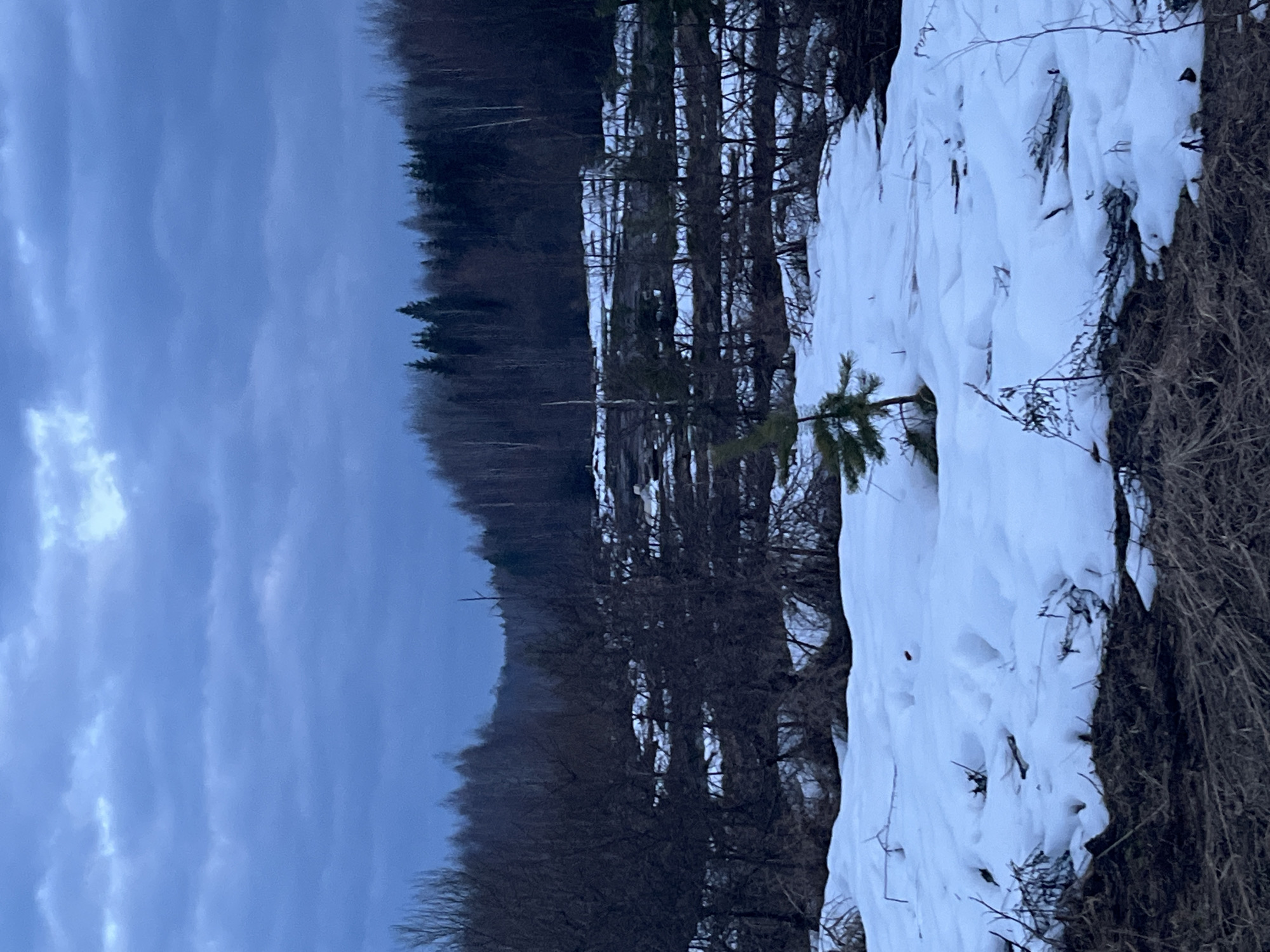 The image depicts a winter scene in Марковский, Russia. The foreground shows a snow-covered ground with a small pine tree emerging from the snow. Adjacent to the snow is a patch of dry, brown vegetation. A line of trees stretches behind the snow-covered area, their branches bare. Further back, a dark, dense forest covers a slight rise in the terrain. The sky above is overcast, with varying shades of blue and grey clouds.