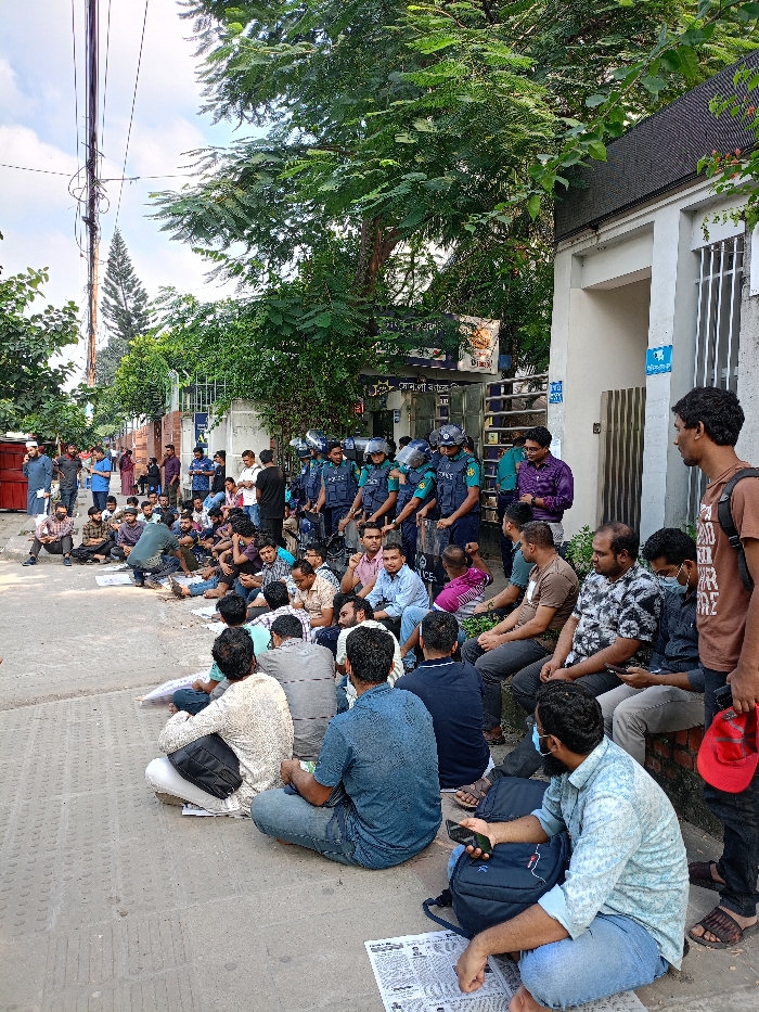 The image captures a daylight scene in Dhaka, Bangladesh, specifically outside a Sonali Bank Limited branch, as identified by prominent signage on the building's facade on the right. Approximately 40 to 50 adult males are seated on the paved street and adjacent concrete sidewalk in the foreground and midground. Several individuals have documents or newspapers laid out before them. Facing this group, a line of 8 to 10 police officers in dark blue riot gear, including helmets, vests, and shields, forms a cordon across the street. The environment features dense green trees and foliage, overhead utility wires on the left, and other urban buildings in the background.