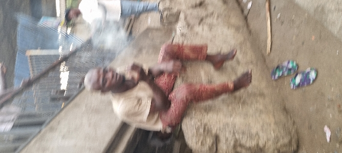 A man with a light-colored shirt lies contorted on a dirty concrete surface. His legs are covered in a red substance. Nearby are a pair of discarded sandals. Another individual, partially visible, is lying in the background wearing jeans. A metal grate and other debris are also present. The scene is out of focus, giving the image an unsteady, chaotic feel.