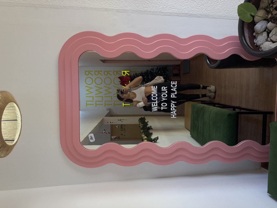 A full-body mirror with a prominent pink wavy frame serves as the central subject, reflecting a young woman taking a selfie inside a Rowlit fitness studio in Cuernavaca, Mexico