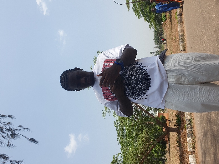 This image depicts an outdoor scene in Ogbogbo, Nigeria, under a bright, clear blue sky with sparse white clouds. A dark-complexioned male with braided hair stands prominently in the foreground on an asphalt road. He wears a white short-sleeved t-shirt featuring a dark, intricate graphic design and light-colored baggy pants. A blue wristwatch is visible on his left wrist. His hands are clasped together at waist height, and his head is bowed, directing his gaze downwards. To the subject's left, a green-foliaged tree with a visible trunk and branches is situated on dry, brown ground, which is separated from the road by a low concrete curb. A faint building structure is partially visible behind the tree. The right background reveals similar dry, brown terrain with sparse vegetation. Several palm trees and a street light pole are visible further back. Two additional individuals are observed in the far right background: one wearing a blue garment, and another, partially obscured, in an orange/brown garment. A light-colored scooter or motorcycle is discernible further in the distance, accompanied by a person. Overhead, dark, slender tree branches extend into the upper left corner of the frame.