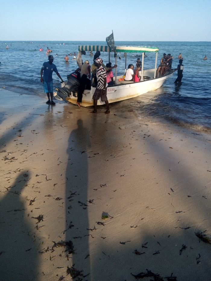 The image displays a bustling beach scene at Shanzu ward, Kenya, characterized by a clear sky and long shadows indicative of either early morning or late afternoon. A white open motorboat, featuring a grey Yamaha outboard motor and a green and white striped canopy, is partially beached in shallow, calm water. A dark flag is attached to a pole at the boat's bow. Approximately five to six individuals are seated or standing within the boat, including one person wearing a white top and another in a red top. One person with light-colored hair is actively stepping into or out of the boat from the sandy shoreline. On the beach, a male in a blue shirt and shorts stands beside the boat's motor, while another male in a striped shirt and shorts stands further to the left, near the boat's stern. Several other individuals are visible swimming and wading in the background water. The light-colored sandy beach is scattered with dark seaweed and small debris, and prominent elongated shadows of unseen individuals stretch across the immediate foreground.