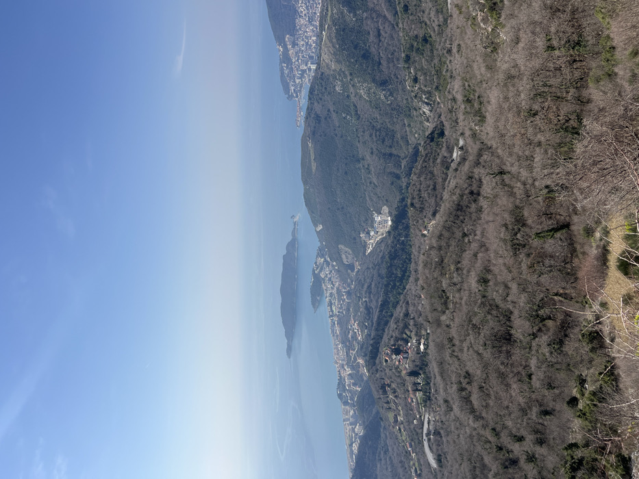 This high-angle panoramic photograph captures a broad coastal and mountainous landscape from Brajici, Montenegro. The top third of the frame shows a clear, light blue sky with minimal atmospheric haze and a few faint, wispy clouds. Below the sky, a vast expanse of calm, deep blue sea dominates the mid-ground, extending to a lighter horizon. An elongated, vegetated island, identified as Sveti Nikola, is prominently situated within the bay in the mid-left. Along the coastline, a densely built urban area, consistent with Budva, Montenegro, is visible, featuring numerous light-colored buildings lining a curved bay and a visible beachfront. Further urban development extends along the coast to the right. The immediate foreground and mid-ground consist of steep, rolling hills and mountains primarily covered in deciduous trees with bare branches, indicating late winter or early spring. Winding asphalt roads are discernible on these slopes, along with scattered residential structures. In a valley towards the mid-right, a complex of larger, light-colored buildings is observed. No individuals, specific actions, or interactions are discernible due to the distant perspective. The scene is illuminated by bright daylight, casting no strong shadows.