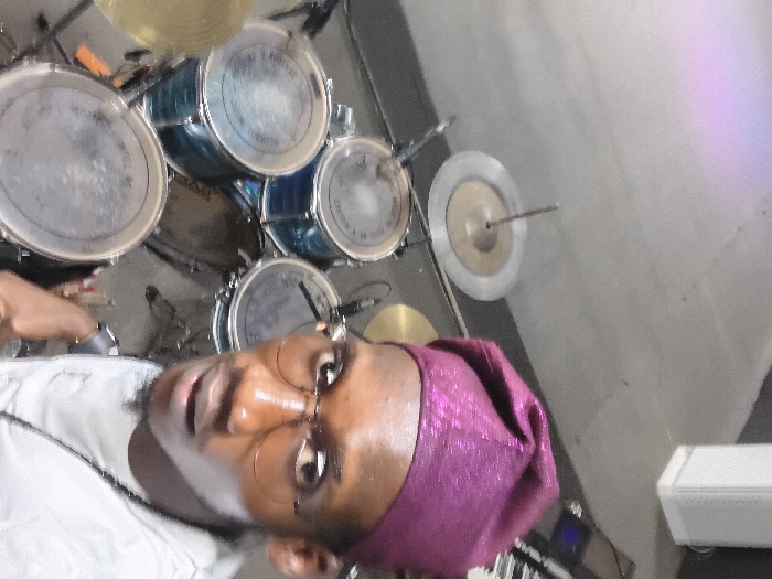 The scene depicts an individual in an indoor setting, identified as located in Onitsha, Nigeria. A Black male, positioned centrally and slightly to the right, takes a selfie. He wears a shimmering purple traditional cap, round gold-rimmed glasses, a light-colored t-shirt, a dark necklace, and a dark wristwatch on his left wrist. He looks directly at the camera with a neutral expression. He is seated or positioned in front of a drum kit. The drum kit features at least five drums with blue/transparent shells and light-colored, worn drumheads. Several cymbals, including a silver crash cymbal and a gold-colored cymbal, are visible, along with microphone stands. In the background to the right, a portion of a black keyboard or synthesizer with white keys is present, adjacent to a white vertical structure. The floor is a light grey, uniform surface. Overhead, faint reflections of purple and pink light suggest ambient or stage lighting. The exact venue within Onitsha is not discernible from the visual data.