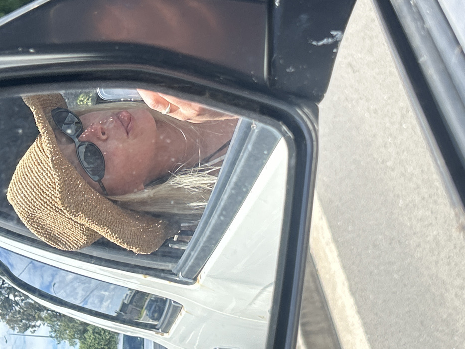 A reflection in a car side mirror shows a fair-skinned woman wearing a straw hat and dark sunglasses
