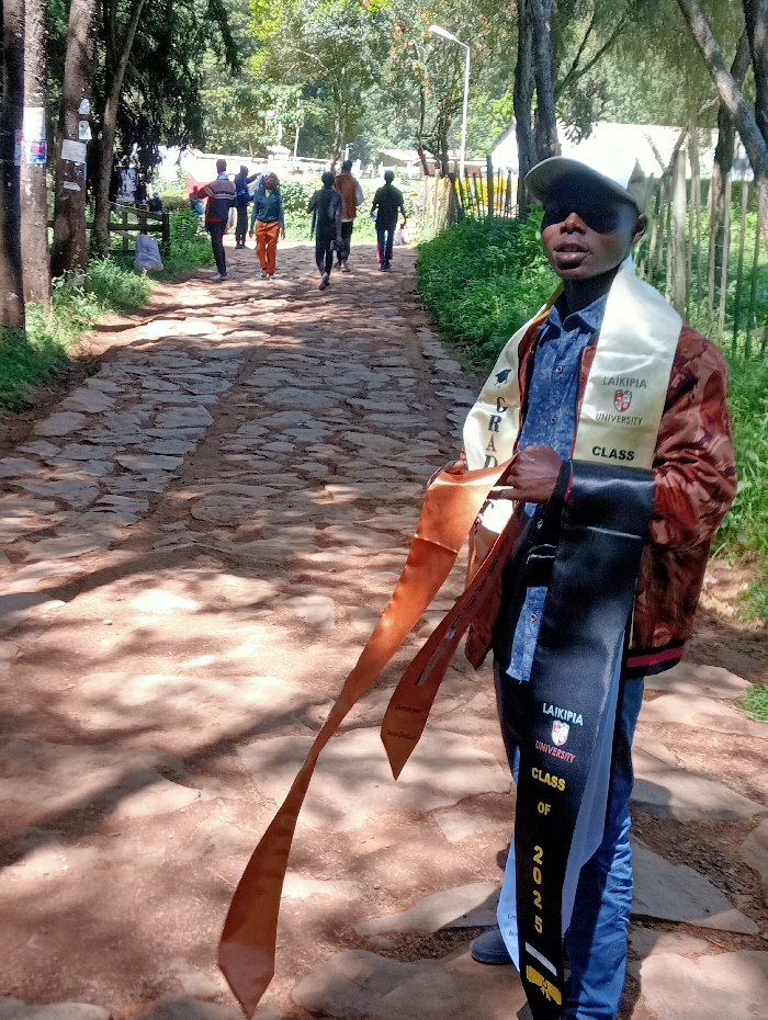 An outdoor scene in Waseges ward, Kenya, depicts a young male in the foreground, positioned on the right, looking directly at the camera. He wears a beige baseball cap, a blue denim shirt, a reddish-brown patterned jacket, and blue jeans. He holds multiple academic sashes: a cream-colored sash over his left shoulder inscribed "LAIKIPIA UNIVERSITY" and "CLASS GRAD," a black sash on his right side marked "LAIKIPIA UNIVERSITY" and "CLASS OF 2025," and two long, reddish-brown sashes hanging downwards, one displaying "CLASS of 2025" and "Junior Graduate." Behind the primary subject, a group of approximately six to eight individuals walks away from the viewer along a winding path. The path is constructed from irregular flagstones or cobbles embedded in dirt. These individuals are casually dressed, with one person notably wearing orange trousers. The environment is characterized by lush green vegetation, including tall trees and bushes, bordering both sides of the path. Papers or posters are affixed to a tree trunk on the left. In the mid-ground, a white utility pole stands on the right side of the path. Distant structures with light-colored walls and dark roofs are partially visible through the trees in the background. The scene is brightly lit by sunlight, casting prominent shadows on the ground.