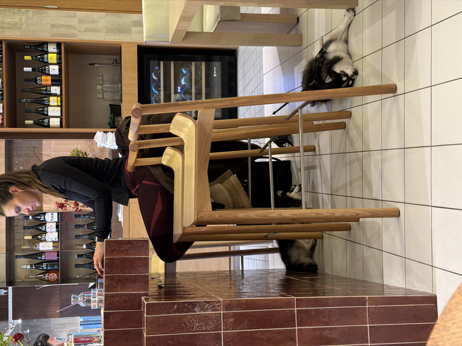 A woman in exercise attire leans over a bar with red brick accents in what appears to be a bar or restaurant. Behind her is shelving filled with liquor bottles and a wine fridge. Two huskies are visible, one lounging on the floor near a wooden chair, the other with only its head visible from under the chair. The setting is indoors, with tiled floors and neutral decor.