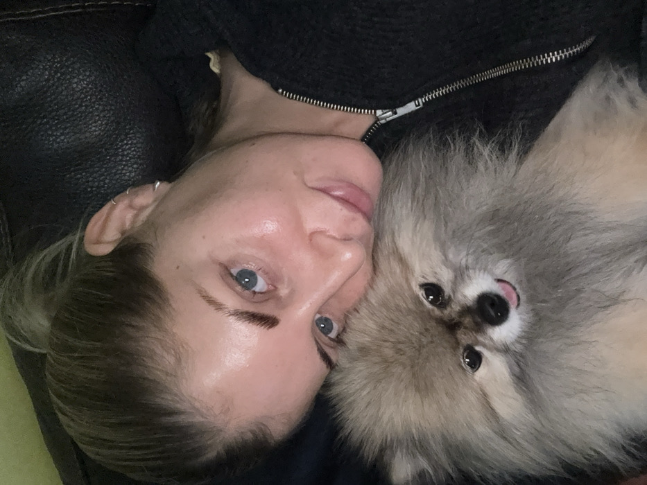 A woman with blue eyes and light skin is lying on a dark leather surface next to a fluffy gray and beige Pomeranian dog. The woman's head is tilted, and she looks at the camera. The dog is resting its head on her chest, with its tongue slightly sticking out. A zipper from her dark top is visible above the dog. The scene is lit unevenly, with some areas appearing darker.