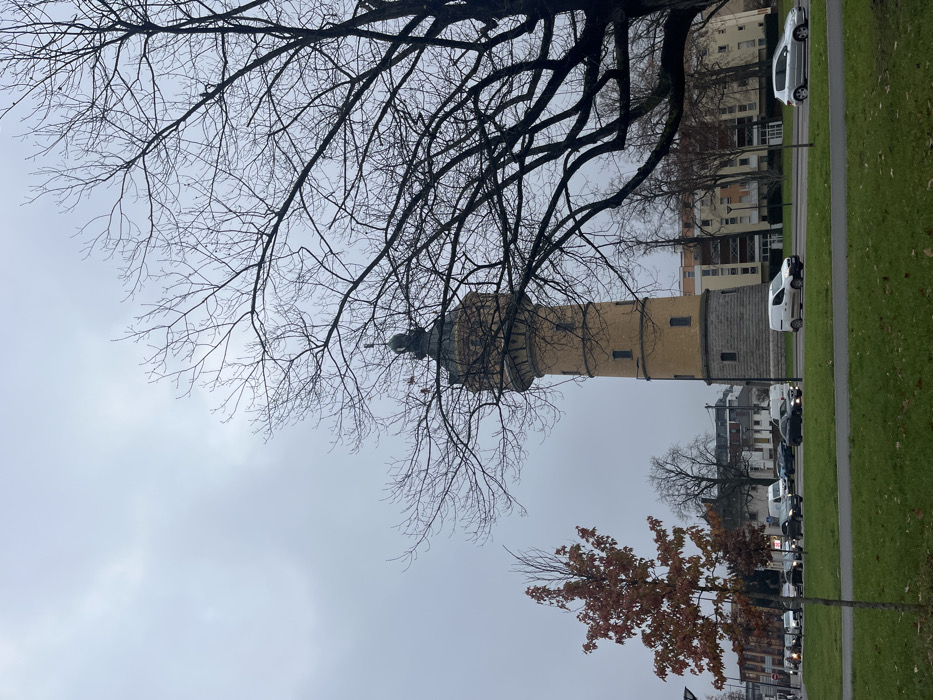 A tall tower, partially obscured by bare tree branches, dominates the landscape under a cloudy sky. The tower transitions from light yellow brick to gray stone. Cars and buildings line a street beside a narrow green strip of grass. An additional tree with brown leaves stands near the street, partially framing the lower right. The overall scene appears to be in an urban or suburban setting.