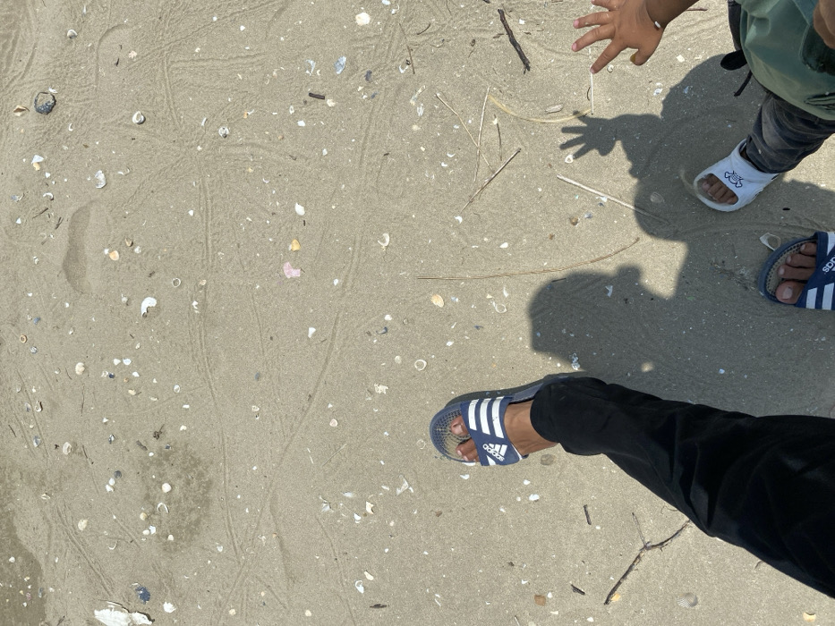 The scene depicts sandy ground in Tanjongkapai, Indonesia, illuminated by an overhead light source casting distinct shadows. The sand is light brown and densely covered with numerous small white, tan, and dark shell fragments, alongside a few larger shells and scattered pieces of organic debris such as twigs and dried plant matter. Faint, irregular linear tracks are visible across the sand's surface. Two individuals are partially visible in the lower half of the frame. In the lower-left, the left leg of an individual, dressed in black pants, is present. Their foot wears a blue Adidas slide sandal featuring three white stripes. In the lower-right, the right foot of a second, smaller individual is visible, wearing a white slide sandal. This person wears dark pants and a segment of a light green garment. The smaller individual's right hand is also visible in the bottom right, with fingers slightly curled. Two shadows are cast on the sand: a larger shadow originating from the first individual, extending from the lower-left, and a smaller shadow from the second individual, located in the lower-right. The smaller shadow distinctly shows a raised hand with splayed fingers, suggesting a gestural action.