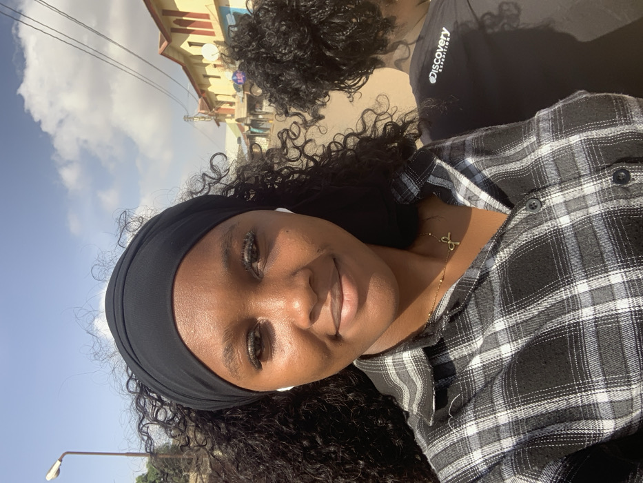 This image depicts an outdoor daytime scene in the city of Jos, Nigeria. In the foreground, a young dark-skinned female is positioned centrally, facing the camera with a slight smile. She wears a black headwrap over dark, curly hair, white wireless earbuds in both ears, a gold-colored necklace with a bow pendant, and a black and white plaid button-up shirt. To her right and slightly behind her, the back of a second individual is visible, displaying dark, curly hair and a black t-shirt with "DISCOVERY EXPEDITION" printed in white on the upper back. The background features a street or pathway lined with buildings, predominantly light yellow/brown with some red detailing on roofs and facades. One building exhibits a white satellite dish. Overhead utility lines traverse the frame against a clear blue sky with scattered white clouds. A tall, light-colored street lamp pole is visible on the far left. The ground appears unpaved. The scene is brightly lit by natural sunlight, casting visible shadows.