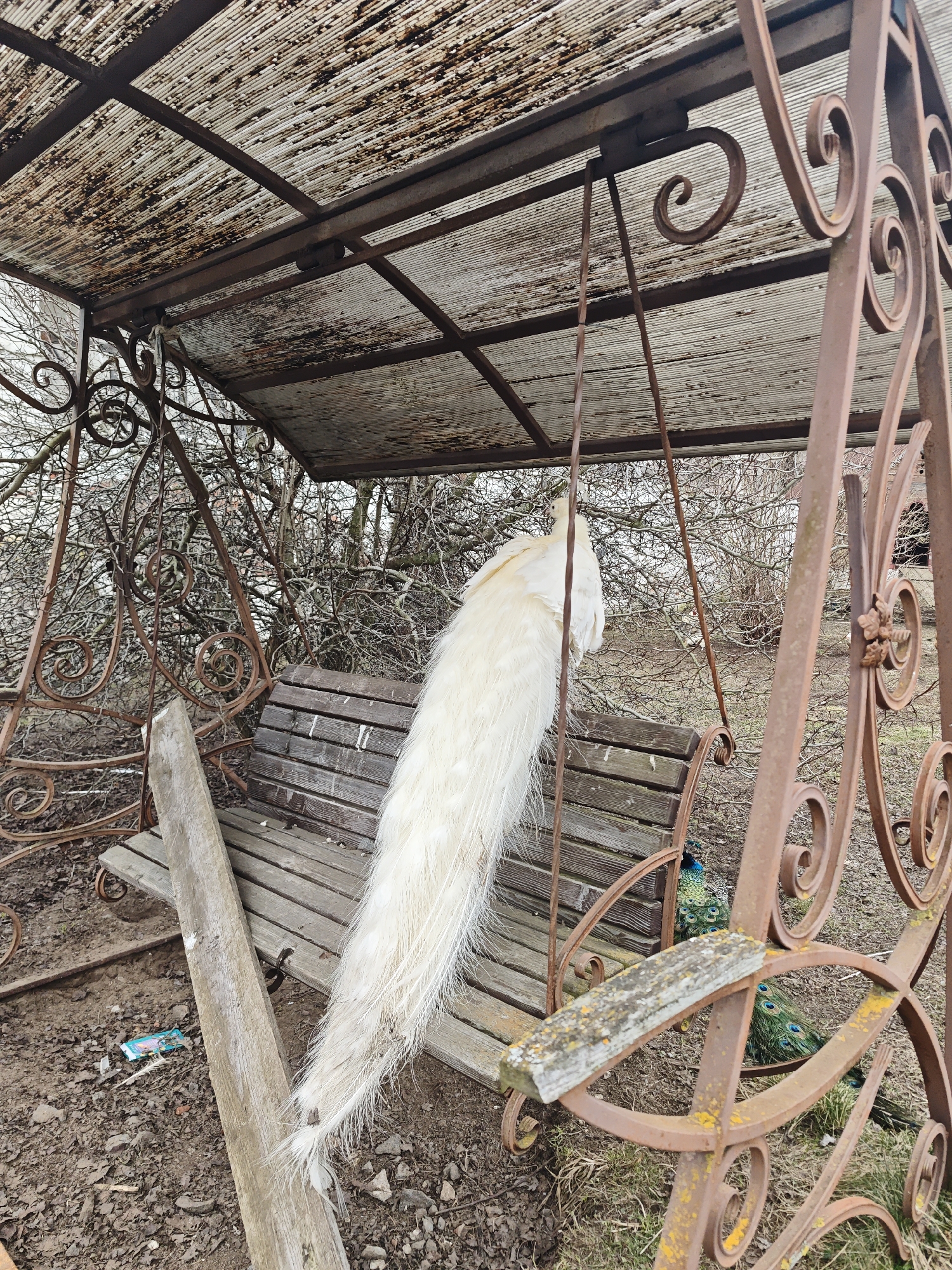 A scene in a likely backyard setting in Луговой, Russia, features an aged metal swing set. The swing's metal frame exhibits ornate scrollwork and rust. The seat of the swing is made of wooden slats, showing wear and stains. A white peacock sits on the swing, its long tail feathers cascading over the edge. Below the swing and partially obscured by the metal frame, a green peacock is also visible. Debris, including a plank of wood and a discarded wrapper, litters the muddy ground around the swing set. Bare trees fill the background, suggesting a season with little foliage. The scene appears neglected, with the swing set and surrounding area exhibiting signs of disrepair and weathering.