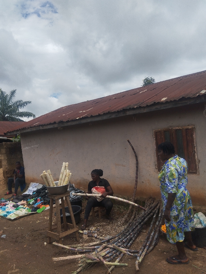 This image captures a street scene in Unguwan Rimi, Nigeria, under an overcast sky. Three individuals are present around an informal market setup. In the foreground, a woman wearing a dark short-sleeved top and dark pants is seated on a low stool, actively peeling or cutting a long stalk of sugarcane with a bladed tool. A pile of light-colored sugarcane pulp and discarded pieces lies on the dirt ground around her. To her immediate left, a tall wooden stand holds a metal basin containing numerous peeled, white sections of sugarcane, cut into uniform lengths. Adjacent to this stand, a black bucket is visible on the ground. A large quantity of unpeeled sugarcane stalks, exhibiting darker purple and green bands, is neatly arranged on the ground in front of the seated woman. One long, slender piece of sugarcane is propped vertically against the nearby building wall. To the right, a second woman, dressed in a vibrant blue, green, and white patterned long dress and brown flip-flops, stands observing the scene, facing towards the seated woman. Her back is slightly angled towards the viewer. On the far left, a man in a dark blue top and dark pants is seated on a low, dark structure, appearing to rest or observe. Next to him, on the ground, a variety of colorful flip-flops and other merchandise are displayed on a light-colored cloth. The background features a single-story building with light-colored, possibly beige or pale brown, walls. The building has a reddish-brown corrugated metal roof and a wooden-framed window with closed shutters. A large palm tree is visible behind the building on the left, and a smaller tree or shrub top is visible above the roofline on the right. The ground throughout the scene is exposed dirt.