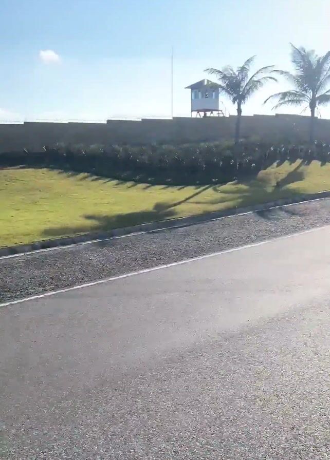 group of people riding motorcycles on a paved road, possibly a parade or organized ride. The first clip shows two motorcycles traveling along the road with palm trees lining the side. The camera pans away from them, and subsequent clips shows a large group of motorcycles coming down the road. The riders are all wearing helmets, and most of the bikes appear to be black. The road has streetlights and a grass divider. The sky is clear and blue.
