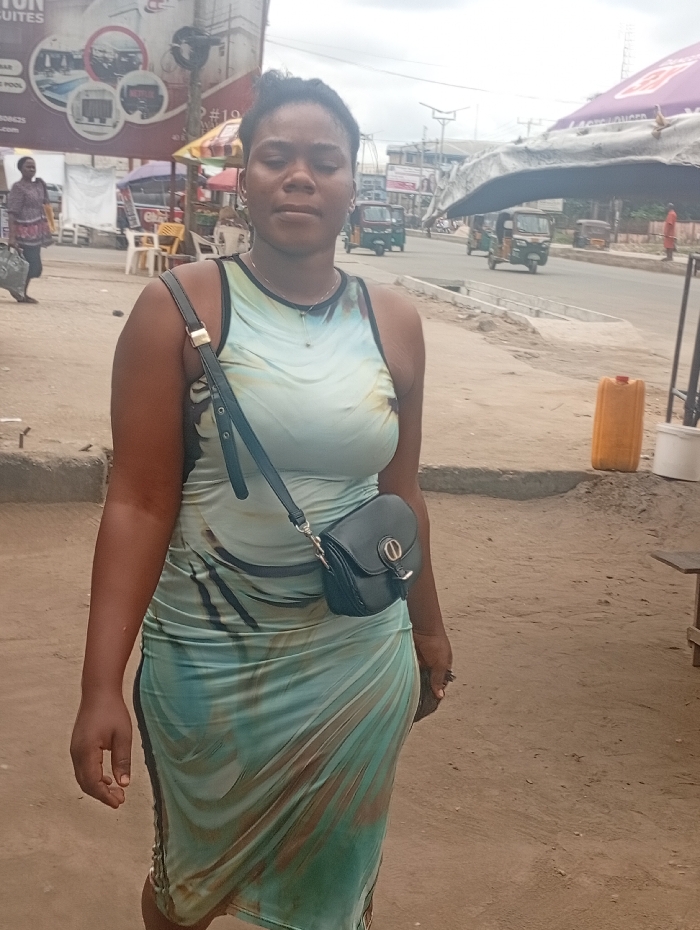 A dark-skinned female, approximately 20-30 years old, stands centrally in the foreground of an outdoor urban environment in Aba, Abia, Nigeria