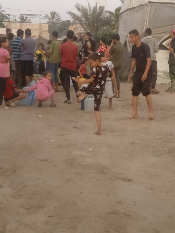 The image depicts an outdoor scene in Al-Mawasi, Unknown, populated by approximately 15-20 individuals, including adults and children, on a light brown dirt ground. The background features several white canvas tents, a partial view of a multi-story building, and multiple palm trees against an overcast sky. In the foreground, a barefoot child, wearing a dark, patterned long-sleeved top and matching pants, is captured mid-action with her left leg raised, positioned directly beside a blue plastic water container. To her immediate left, another child, dressed in a pink tracksuit, squats on the dirt near two more blue plastic water containers. Further into the scene, a barefoot male in a dark t-shirt and dark shorts stands, observing towards the left. A concentrated group of individuals is gathered behind the foreground children, including an adult male in a red t-shirt facing away from the viewer, an adult male in a striped blue and white shirt, and several other adults and children. Additional blue plastic water containers are visible throughout the general gathering area. The environment suggests a temporary settlement or encampment.