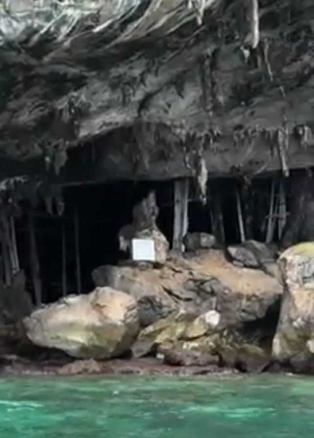 The camera films from a boat moving slowly towards a sea cave. The entrance to the cave is low, narrow, and dark. Stalactites hang from the cave’s roof. In front of the cave, rocks are visible at sea level. Some wooden poles and scaffolding are visible just inside the cave entrance. A small white sign is set on the rocks near the cave entrance. A small tree grows on the rocks to the right of the cave entrance. The water is a clear green color.