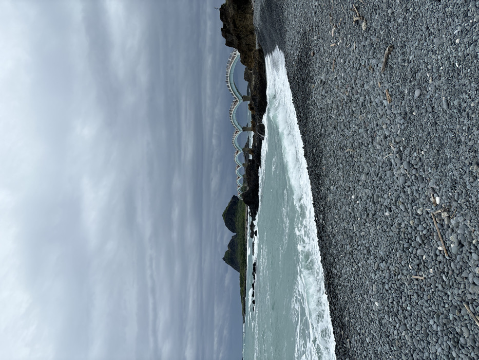 A grayscale beach scene features a rocky shoreline and a cloudy sky. Smooth, dark pebbles cover the beach. Waves crash along the edge, creating white foam. In the distance, a series of arched structures connects rocky outcrops, creating a bridge-like appearance. Further, a small, green, cone-shaped island adds depth to the vista.