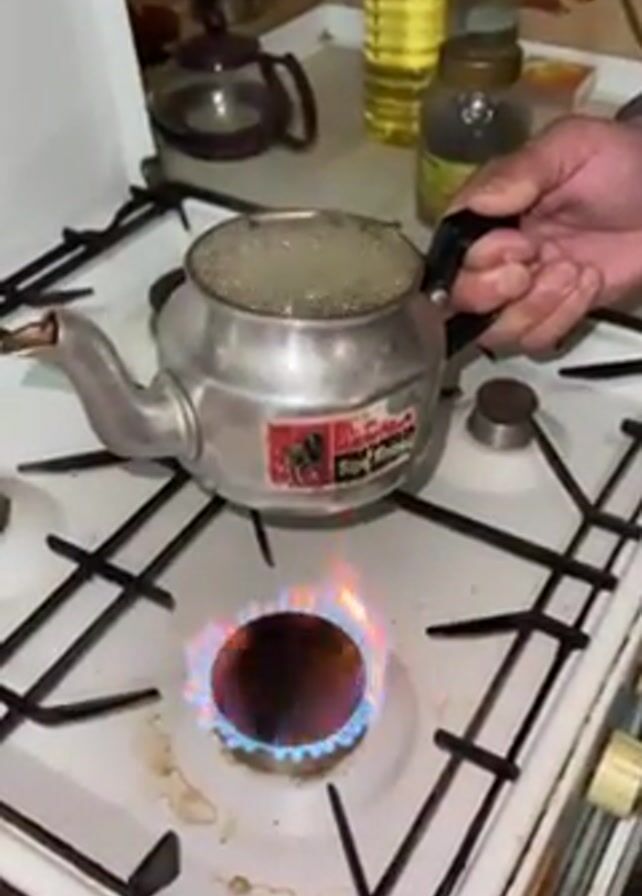 A hand stirs a silver kettle with a black handle on a white gas stovetop. Bubbling water is visible inside the kettle. The stovetop grate is black, and a blue flame is burning beneath the kettle. The background shows a kitchen counter with bottles of oil and other containers.