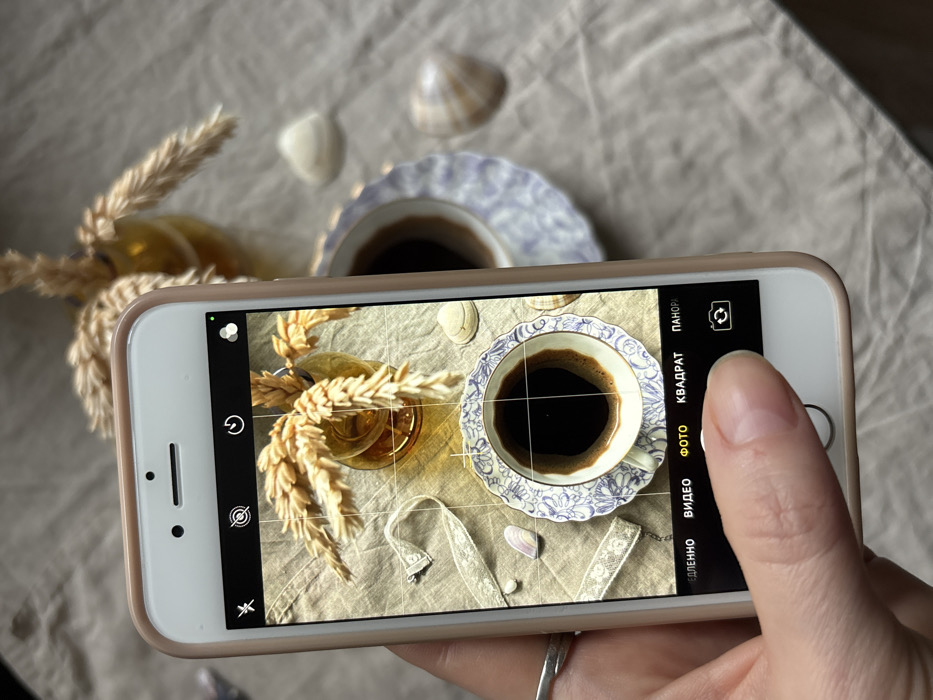 An overhead shot depicts a person's left hand holding a white smartphone, encased in a light pink cover, actively capturing a still life photograph. The smartphone's screen displays its camera interface, showing a grid overlay and highlighting "Фото" (Photo) mode in Russian. The subject within the phone's frame consists of a white ceramic teacup with blue floral patterns, filled with dark coffee, positioned on a matching saucer. To its upper left, a piece of off-white lace trim is visible. Above the teacup, an amber-colored glass vase holds dried wheat stalks. Two small, light-colored seashells are placed near the teacup. The person's thumb is positioned over the digital shutter button on the screen. A plain silver ring is present on the ring finger. The scene, both within and outside the phone's display, is set on a light beige, textured fabric surface. In the blurred background to the right, a second identical teacup with coffee and saucer, along with additional seashells, are partially visible. This activity is situated in the city of Kudrovo, Russia.