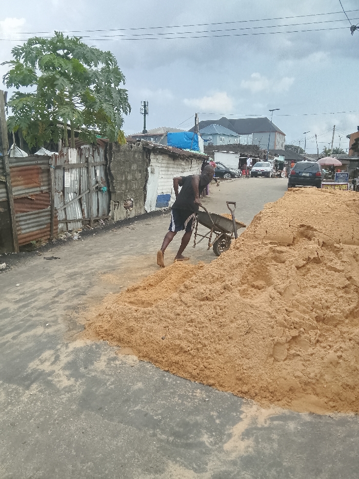 The image presents an outdoor street scene consistent with an urban environment in Port-Harcourt, Nigeria, under an overcast sky. In the foreground-midground, a barefoot adult male, dressed in a dark top and dark shorts with white stripes, pushes a single-wheeled metal wheelbarrow. The wheelbarrow contains a small amount of light brown sand, with a shovel or spade resting within it. Immediately to the right, a large, uncontained mound of light brown sand occupies a significant portion of the paved road. To the left, a weathered and rusted corrugated metal fence stands alongside a partially degraded white-painted concrete block wall. A large papaya tree with broad green leaves is visible above these structures. The paved road extends into the background, where multiple vehicles, including a dark sedan and a white car, are parked or in motion. Various buildings, some featuring blue tarps on their roofs, line the street. A tall cellular communication tower and overhead utility wires are visible against the grey sky. Further down the street on the right, a red and white striped umbrella and a partial yellow sign indicate a street vendor presence. The scene depicts ongoing construction or labor activity within a populated residential or mixed-use area.