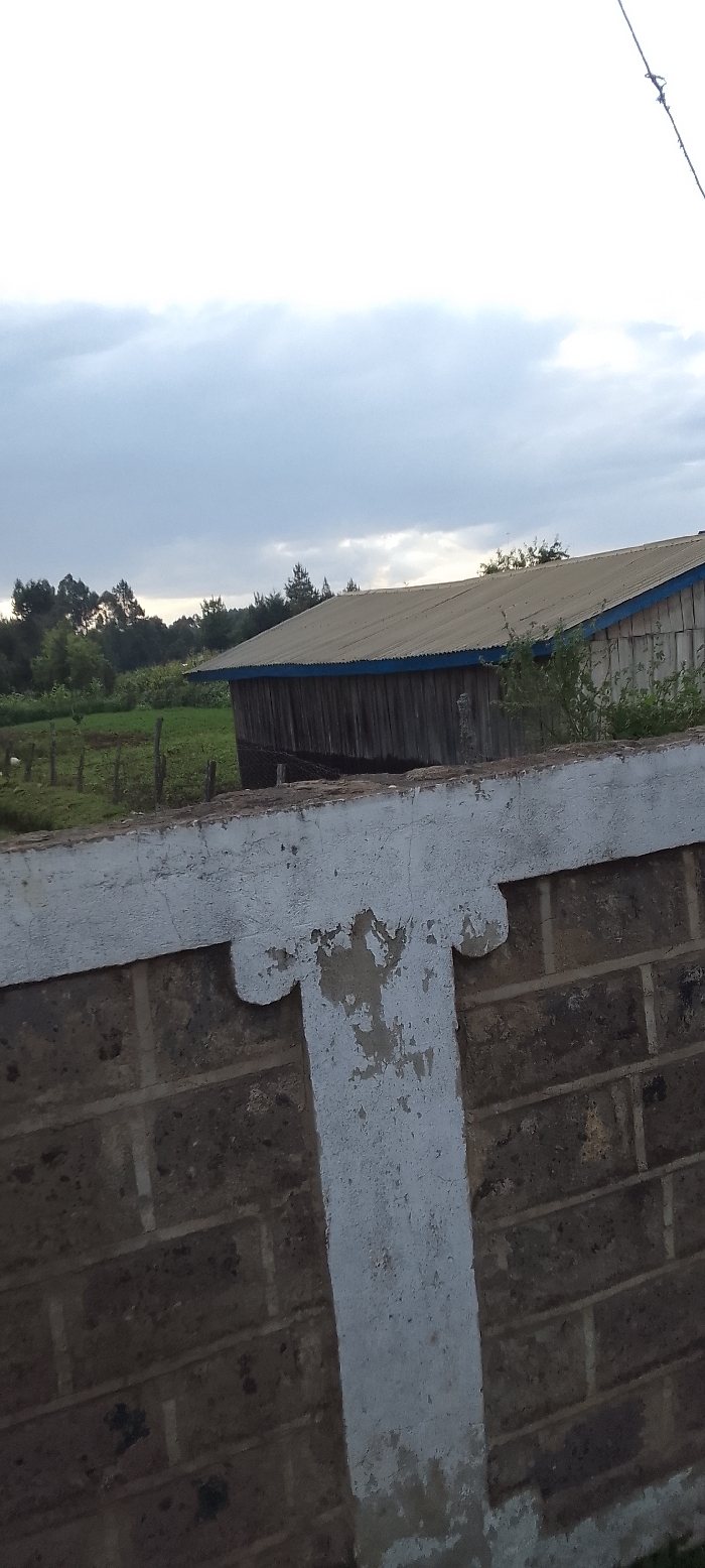 The image presents a static outdoor scene in an unspecified area of Kenya, captured under an overcast sky. In the immediate foreground, the top section of a weathered masonry wall is visible, constructed from dark, possibly concrete or stone, blocks with visible mortar joints. A significant portion of this wall, including a horizontal cap and a vertical section, is coated in peeling, discolored white paint. Beyond the wall, a expanse of green vegetation, possibly a field, is present. A rudimentary fence made of wooden posts is partially visible on the left side of this vegetated area. To the right, a single-story structure with dark, vertically oriented wooden siding and a light-colored corrugated metal roof with a blue trim along its eaves is positioned. Sparse green shrubbery grows near the base of this structure. In the background, a dense treeline extends horizontally, obscuring the horizon. The sky is largely overcast, with areas of diffused brightness, suggesting either early morning, late afternoon, or a heavily clouded day. No human subjects or active elements are depicted within the frame. A thin, dark line, possibly a wire, descends from the upper right corner of the image.
