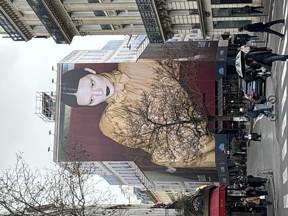 This image captures a dynamic street scene at the Carrefour de l'Odéon in the 6th arrondissement of Paris, France, under an overcast sky. The central focal point is a multi-story building completely covered by a massive fashion advertisement. The billboard displays a woman from the chest up, characterized by pale skin, a direct and intense downward gaze, slicked-back dark hair with a distinct central parting, and dark lipstick. She wears a high-collared, mustard-yellow blouse with a prominent bow at the neck, set against a deep red background. In the foreground, a prominent leafless deciduous tree stands, its bare branches partially obscuring the billboard. The street below is active with pedestrians and vehicles. To the left, a group of pedestrians is visible near a building featuring a red awning with "DANTON" and "BEAUTÉ" signage. Across the foreground crosswalk, a person wearing a white helmet and a blue jacket rides a compact folding bicycle. Slightly behind and to their left, another individual on a motorized scooter or e-bike is visible. Further right on the crosswalk, a pedestrian walks towards the viewer, holding a black umbrella. Additional pedestrians populate both sidewalks and cross various points of the intersection. A dark-colored car is stationary or moving slowly in the street, and a motorcyclist is seen further down the road. The buildings flanking the street exhibit classic Parisian Haussmannian architecture, with detailed facades, ornate iron balconies, and shuttered windows. The base of the billboard-covered building houses street-level establishments, including a restaurant named "LE HIBOU." Scaffolding is visible on the rooftop of a building in the background.